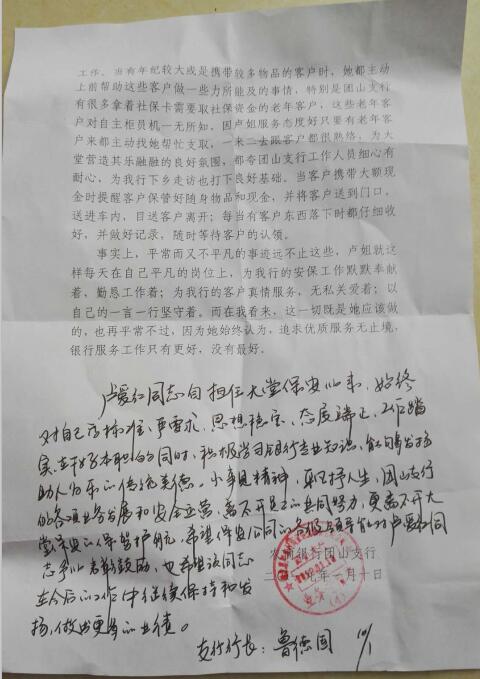 在客流量較多時地能主動鋪助大堂經(jīng)理完成客戶的分流和引導工作,當有年紀較大或是攜帶較多物品的客戶時,她都主動上前幫助這些客戶做一些力所能及的事情,特別是團山有很多拿著社??ㄐ枰∩绫YY金的老年客戶,這些老年客戶對自主柜員機一無所知,因盧姐服務態(tài)度好只要有老年客戶來都主動找她幫忙支取,一米二去跟吝戶都很熟絡,為大堂營造其樂融融的良好氛圍,都夸團山支行工作人員細心有耐心,為我行下鄉(xiāng)走訪也打下良好基礎。當客戶攜帶大額現(xiàn)金時提醒客戶保管好隨身物品和現(xiàn)金、并將客戶送到門口送進車內(nèi),日送客戶離開;每當有客戶東西落下時都仔細收好,并做好記錄,隨時等待客戶的認領